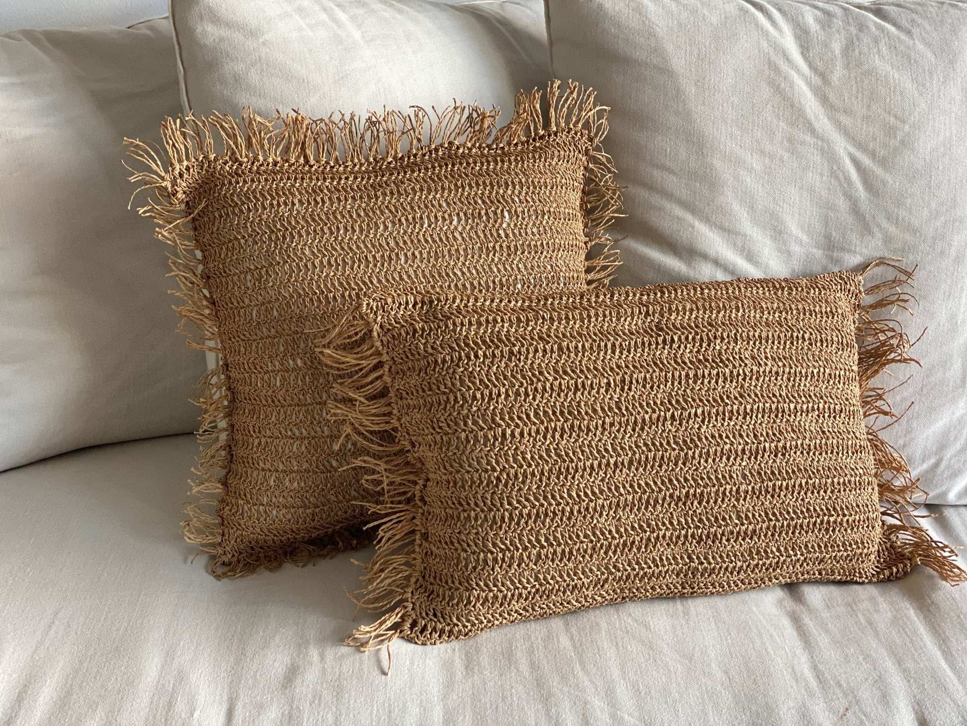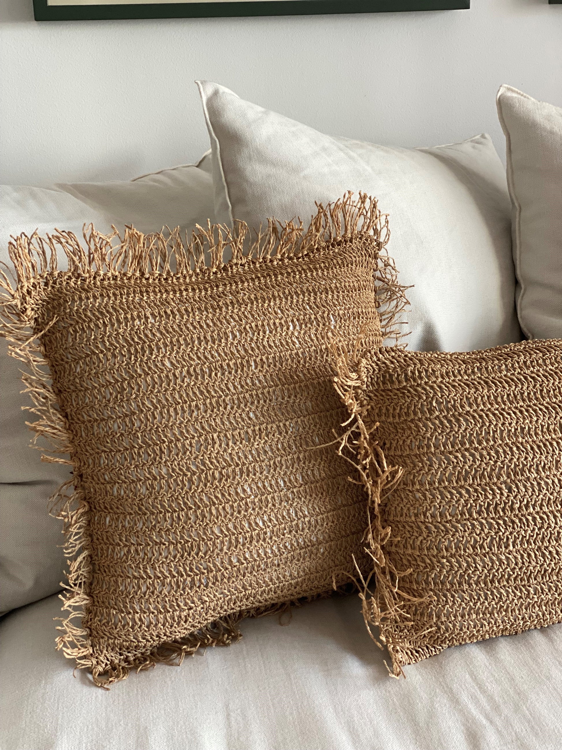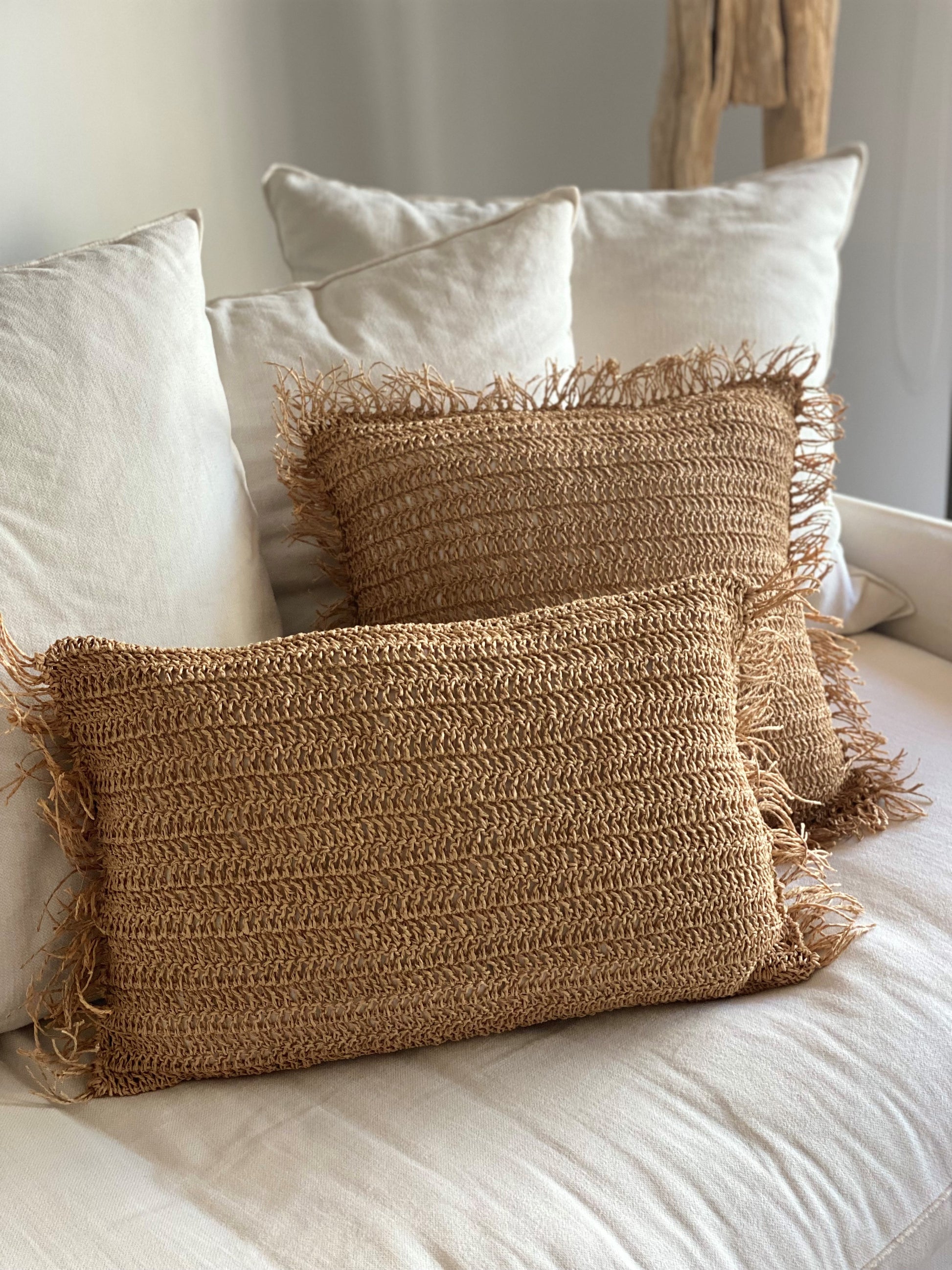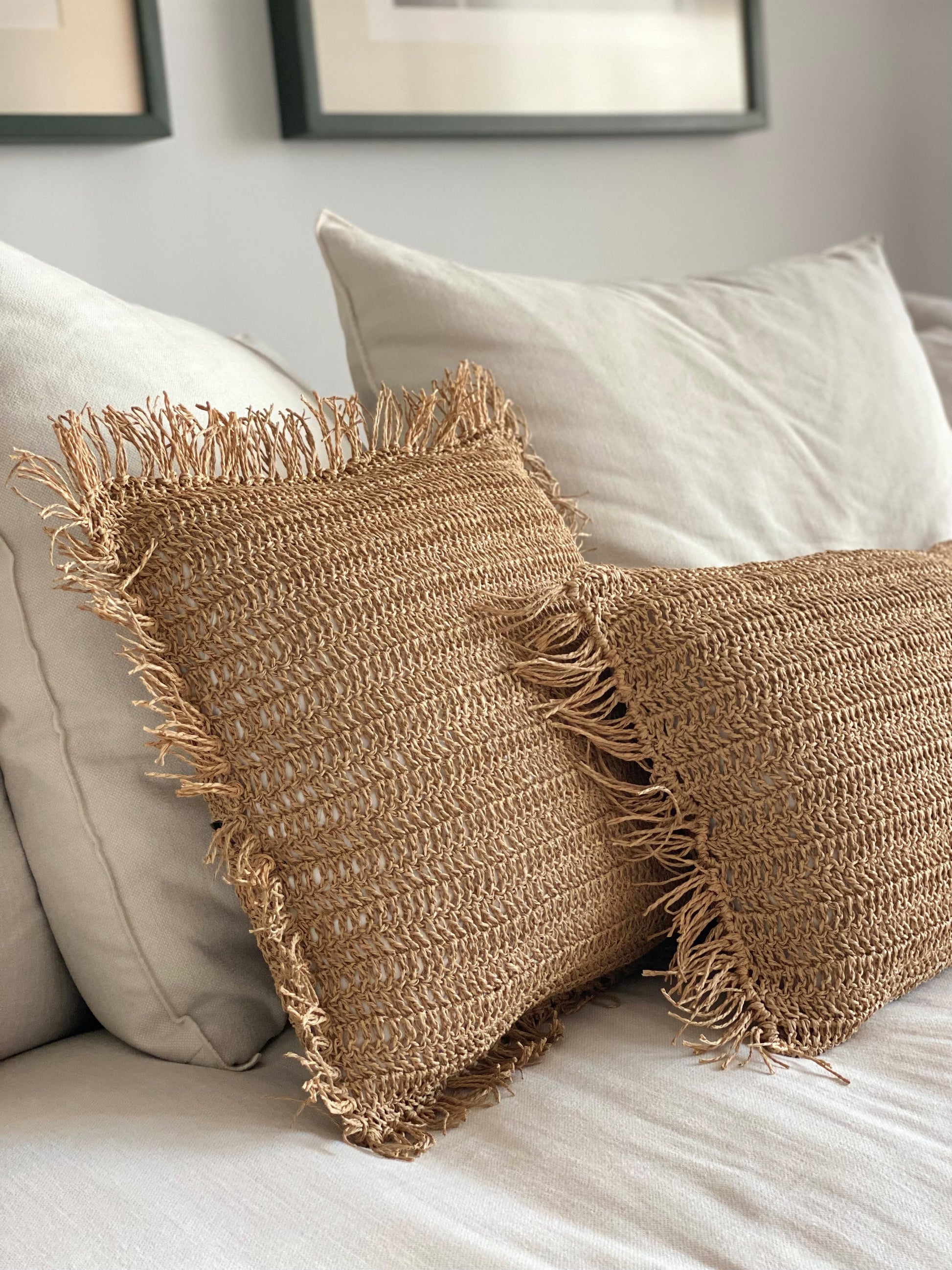Funda de cojín tejida hilo de papel,con flecos de color natural hechos a mano.(Cojín para enfundador no esta incluido)