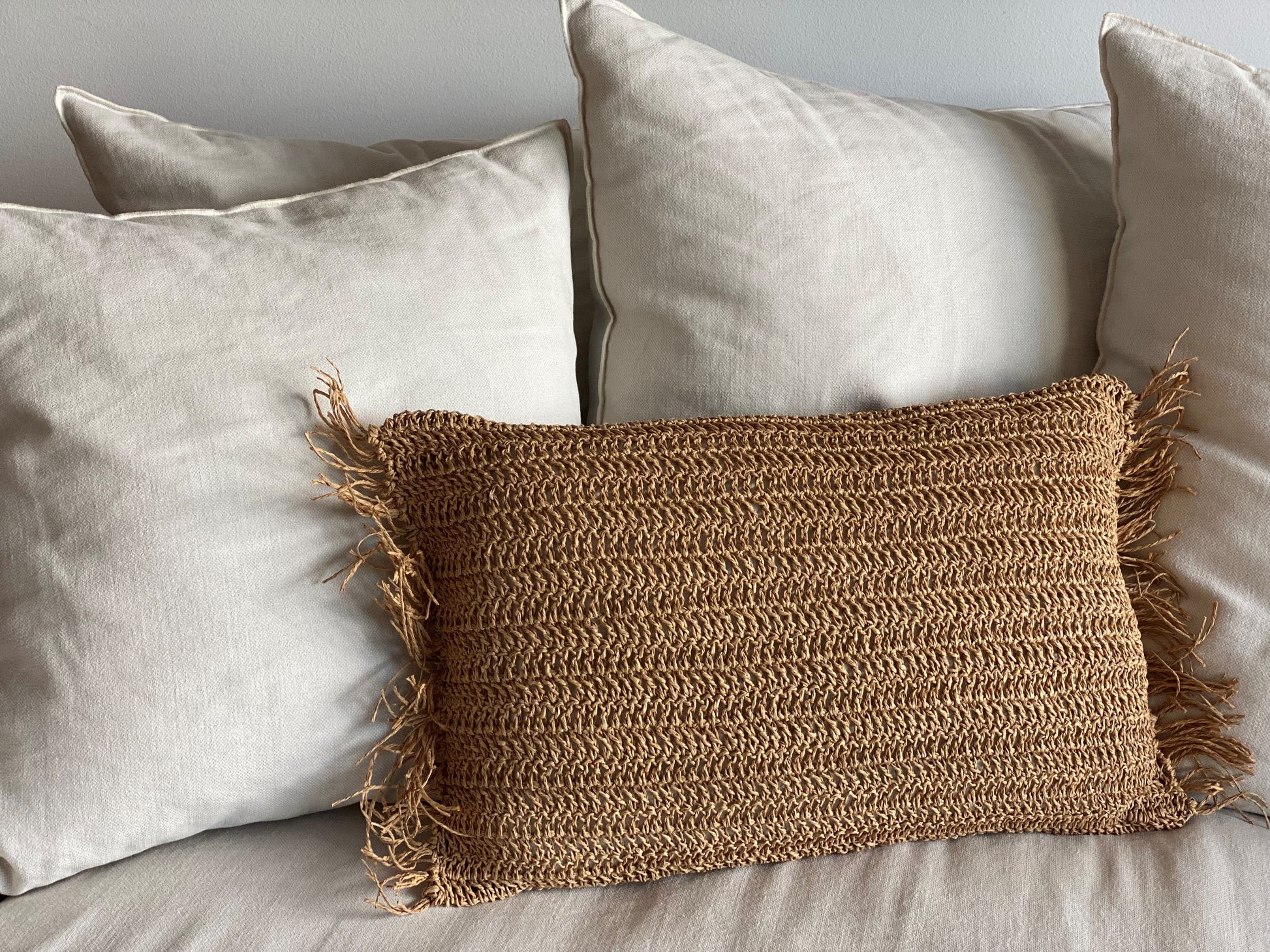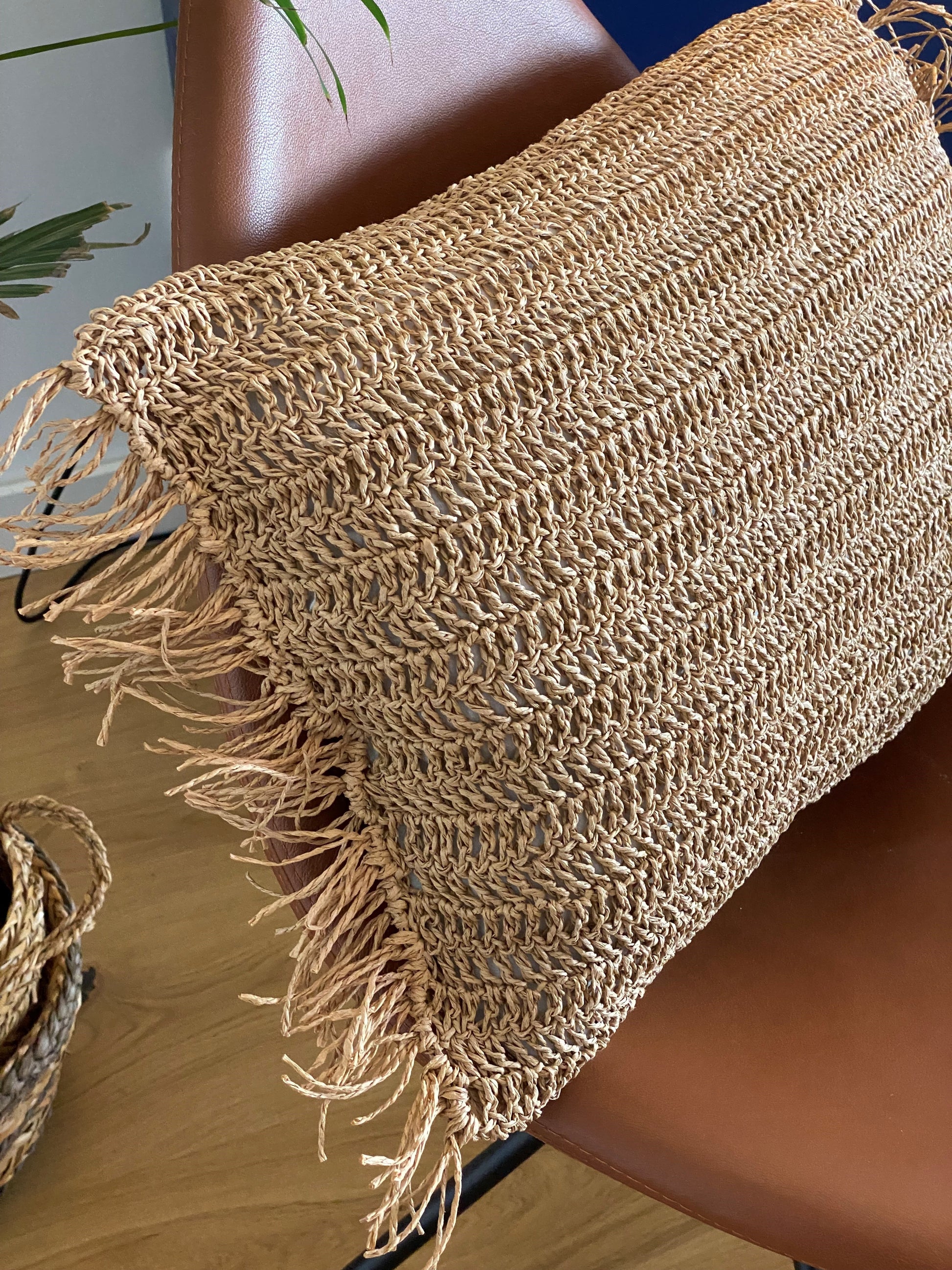Funda de cojín tejida hilo de papel,con flecos de color natural hechos a mano.(Cojín para enfundador no esta incluido)